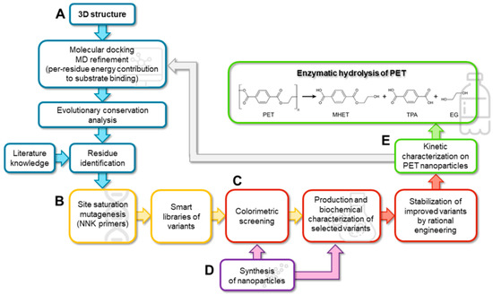 Scheme of the proposed multidisciplinary workflow for producing improved variants of PHEs by SSM and rational protein stabilization. (A) Blue, in silico design; (B) yellow, molecular biology; (C) red, biochemistry; (D) purple, chemistry; (E) green, biocatalysis.