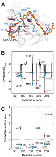 Computational analysis of the interaction between ΔIsPET and 2-HE-(MHET)6. (A) ΔIsPET:2-HE-(MHET)6 complex. Representative frame of the MD simulation of the ΔIsPET:2-HE-(MHET)6 complex possessing the minimum estimated ΔGbind. The ligand 2-HE-(MHET)6 is represented as sticks and colored according to atom type (carbon in gray and oxygen in red): the carbon of the ester bond of the substrate which undergoes the nucleophilic attack is indicated by a black circle. Protein residues are visualized as balls and sticks; residues whose average contribution to ΔGbind is ≤−1 kcal mol−1 are depicted in blue or purple, if excluded or considered for SSM, respectively. Ser160 has a positive ΔGbind because it was harmonically constrained to the attacked carbonyl of the docked ligand. Residues forming the catalytic triad are depicted in pink. (B) Plot of average and standard deviation of estimated per-residue ΔGbind. The dashed bar represents the ΔGbind threshold of −1 kcal mol−1 used to predict hot-spot residues interacting with 2-HE-(MHET)6. (C) Plot of average Rate4Site conservation scores for ΔIsPET residues whose binding contribution is ≤−1.0 kcal mol−1. The dashed bar represents the average conservation rate of the whole sequence (=1.2). Symbols in panel (B,C) are colored accordingly to the color scheme of panel (A).