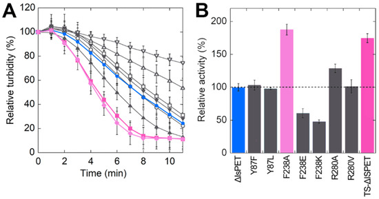 Hydrolytic activity of ΔIsPET variants on PET nanoparticles. (A) Decrease in turbidity of the reaction mixture as a function of time. (B) Relative activity of variants on PET nanoparticles (the activity of the wild-type enzyme is set as 100%). Reaction conditions: 50 mM sodium phosphate buffer, 100 mM NaCl, pH 8.0, at 30 °C with 0.094 mg mL−1 of nanoparticles and 0.04 mg mL−1 ΔIsPET variants. ΔIsPET (●, blue), Y87F (○), Y87L (□), F238A (♦, pink), F238E (△), F238K (▽), R280A (▲), R280V (▼), and TS (■, violet) variants. Error bars indicate the standard deviation (n = 3).