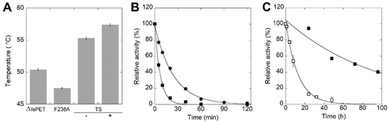 Thermal stability of ΔIsPET variants. (A) Tm values of F238A and TS-ΔIsPET variants determined by CD spectrometry at 222 nm (mean ± standard deviation); for TS variant the value is given in the absence (−) and in presence (+) of 10% glycerol. Measures were performed in duplicate. (B) Time course of thermal inactivation of ΔIsPET (●) and F238A-ΔIsPET variant (■) at 50 °C. (C) Time course of thermal inactivation of TS-ΔIsPET variant in the absence (□) and in presence (■) of 10% glycerol. Reaction conditions in panels (B,C): 50 mM sodium phosphate buffer, 100 mM NaCl, pH 8.0, at 50 °C with 0.15 mg mL−1 ΔIsPET variants. Residual activity was detected by the pNPA assay. The activity value determined at time = 0 min was set as 100%; values are reported as mean ± standard deviation (n = 3).