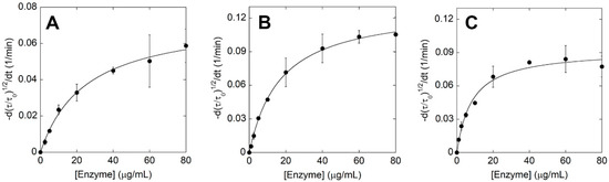 A detailed kinetic investigation was performed on ΔIsPET, F238A-ΔIsPET, and its thermostabilized counterpart TS-ΔIsPET (Figure 1D,E). The decrease in turbidity of the PET nanoparticles solution was recorded in the presence of increasing concentrations of enzyme (up to ~80 μg mL−1) at pH 8 and 30 °C (Figure S5A–C). The square root of the rate of turbidity decrease measured in the linear part of the plots was plotted as a function of the enzyme concentration. Data were fitted using (Equation (2)) to obtain the maximal rate of the ester bond cleavage of amorphous PET domains (kτ) and the affinity constant between the enzyme and PET (KA) (Table 1); a hyperbolic behavior was observed for all the enzymes (Figure 5A–C). Only for the TS-ΔIsPET a slight decrease in the reaction rate was observed at the highest enzyme concentrations (80 μg mL−1) (Figure 5C). This effect was already apparent for the enzymatic hydrolysis of PET nanoparticles by Thermobifida fusca KW3 cutinase (TfCut2) and of poly(3-hydroxybutyrate) by poly(3-hydroxybutyrate)-depolymerase A from Pseudomonas lemoignei and was attributed to the adsorption of the enzyme to the surface of nanoparticles that, at high concentrations, exceeds the theoretical maximum monolayer amount, thereby not conforming to the Langmuir-type model [3,23]. The F238A substitution significantly improves both kinetic parameters: the kτ and KA are ~1.6-fold and ~2-fold higher than ΔIsPET, respectively. The kτ of TS-ΔIsPET was only slightly lower than the one of F238A-ΔIsPET variant, but significantly higher than the one of ΔIsPET, and the affinity for PET was further increased (~128% and ~250% in comparison with F238A-ΔIsPET and ΔIsPET, respectively) (Table 1). This suggests the existence of only a marginal epistasis between the stabilizing S121E and D186H substitutions and the alanine introduced at position 238.
