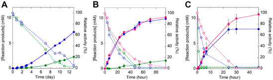 Biodegradation of PET microplastics by TS-ΔIsPET variant at (A) 30 °C, (B) 40 °C, and (C) 45 °C. The reaction was followed through the determination of the total amount of soluble reaction products in the supernatant of the reaction mixture (continuous line): ΔIsPET (green), TS variant (blue), and TS variant in the presence of 10% glycerol (red). The residual activity of the enzyme in solution is reported as dashed lines. Reaction conditions: 9 mg mL−1 of microparticles and 0.1 mg mL−1 of ΔIsPET variants in 50 mM sodium phosphate buffer, 100 mM NaCl, pH 8.0. Biodegradation kinetics were performed in triplicate.