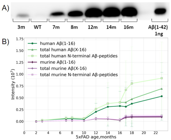 Dynamics of accumulation of Aβ in the brain of 5xFAD mice with age. (A) WB of Aβ extracted from 1 mg of brain tissue from mice of different ages. (B) Accumulation of human and murine Aβ with mouse age measured by LC-MS/MS. The accumulation and transformation of both native mouse Aβ (murine Aβ shown in purple) and transgenic human Aβ (shown in green) were monitored. Aβ (1–16) shows the changes in the intensity of a peptide starting at position 1 and ending at position 16, i.e., containing the first 16 N-terminal amino acids of Aβ. Aβ (X-16)—shows the sum of intensities of the variety of peptides starting at different positions on the N-terminus, i.e., 1, 2, 3, and so on, and all ending at position 16. The deviation of this value from the Aβ (1–16) curve demonstrates the input of the various truncated forms. Total N-terminal Aβ peptide curves show the sum of the intensities of all N-terminal peptides starting at various positions on the N-terminus, and ending at different positions on the C-end of the corresponding peptides. The deviation of these curves from the previous ones shows the accumulation and input of peptides carrying missed cleavages.