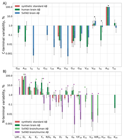 (A) C-terminal and (B) N-terminal variability of detected Aβ forms. Input of various Aβ forms ending (A) or starting (B) at each position of the sequence indicated at the horizontal axis to the total intensity of the corresponding terminal peptides for the synthetic standard, human, and murine peptide extracts from 5xFAD mice or the human AD sample. Mean values ± SD are shown, significant differences (p < 0.05) between human Aβ from the human and 5xFAD brain samples and between human and murine Aβ, both from the 5xFAD samples, are marked with green and purple asterisks (*), respectively. p-values for statistically significant/insignificant differences between groups are shown in Supplementary Table S2H,N.