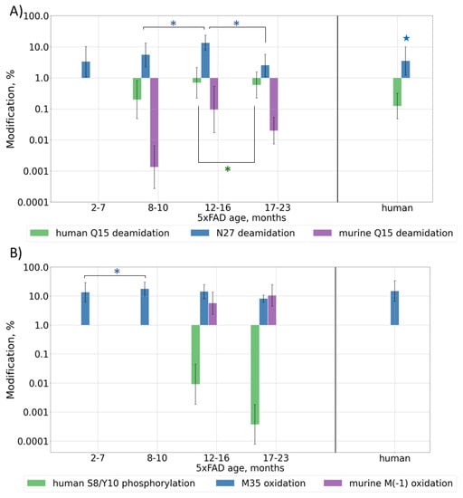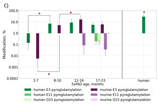 Content of various post-translationally modified (PTMs) Aβ forms in peptide extracts from 5xFAD mice of different ages or human AD sample: (A) deamidation of Q15 and N27; (B) phosphorylation of S8/Y10 and oxidation of M35, M(-1); (C) pyroglutamylation of E3, E11, Q15. Average values ± SD are shown. For better visualization, mice were grouped by age according to the phases of Aβ accumulation (Figure 1B). Monthly values can be found in Figure S5. p-values < 0.05 were considered as significant. Significant differences between age groups of mice are marked with asterisks (*). For comparison with the human AD reference brain sample, average values for mice over 6 months of age were taken (shown with stars 🟊). p-values can be found in Supplementary Table S3.