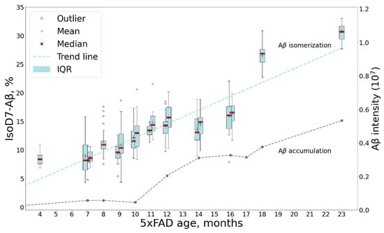 The dynamics of isoD7-Aβ content in 5xFAD mice brain samples studied by MALDI TOF/TOF. The boxplot graph shows the changes in the isoD7-Aβ content in samples from mice of different ages. For timescale comparison accumulation of human Aβ with mouse age measured by LC-MS/MS (see Figure 1) is also shown. Average values for combined mouse age groups and significance estimations can be found in Figure S7.