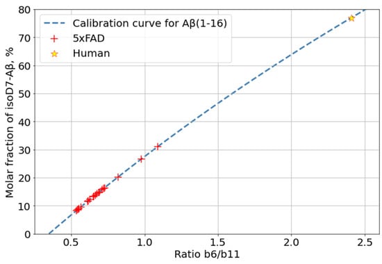 In the human AD patient, the isoD7-Aβ content, according to our measurements, turned out to be approximately 76%. This is consistent with the results of previous studies [17,18,20,22]. Thus, the maximal level of isoD7-Aβ in 5xFAD mice is much lower than that in human AD brain tissues (Figure 5). This is probably due to the short lifespan of mice and the insufficient time for both the total Aβ and its isomerized forms to reach the kinetically stable plateau levels.