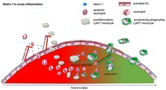 Netrin-1 in acute inflammation. Acute inflammation is defined by a rapid influx of neutrophils into the inflamed tissue to combat the intruding pathogen. This is followed by a monocyte recruitment to extend the rapid immune response. In many different models, it has been shown that netrin-1 can very effectively mitigate the influx of neutrophils and monocytes and thereby dampen the acute inflammatory response. The acute, initial phase is followed by a resolving phase, in which neutrophils undergo apoptosis and are taken up by monocytes. The efferocytosis in turn promotes the differentiation of pro-inflammatory into anti-inflammatory monocytes. This phenotype switch and the monocyte egress in acute inflammation is facilitated by netrin-1.