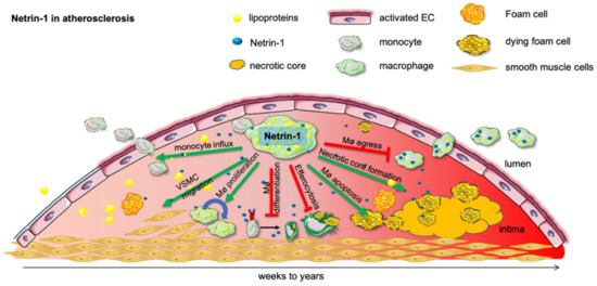 Netrin-1 produced by macrophages plays a proatherogenic role: first, it prevents macrophage migration and the egress from the plaque; second, it promotes lesion progression while enhancing the chemoattraction of smooth muscle cells and their recruitment into the intima [21,111,112].