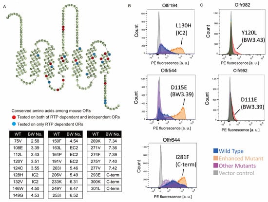 Identification of mutation residues enhancing OR expression. (A) Snake plot showing the consensus sequence of mouse ORs. Circle: Amino acid site that constructed the mutant. Red: tested on both of RTP dependent and independent ORs, Blue: tested on RTP dependent ORs only. The table shows the mutation sites and BW (Ballesteros-Weinstein) number [20] tested in this study. (B,C) The cell-surface expression of the RTP independent OR (Olfr194, Olfr544 and Olfr644) and RTP dependent ORs (Olfr982 and Olfr992), respectively. Each mutant was transfected into HEK293T cells, and the cell surface expression level was measured. X-axis: PE fluorescence, Y-axis: cell number.