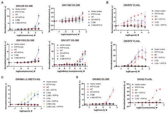 Dose-response curve of each mouse OR mutant. (A) D3.39E mutants of Olfr339, Olfr1352, Olfr1353 and Olfr1377, (B) Y3.43L mutants of Olfr978 and Olfr979, (C) Olfr960 L3.39E, Y3.43L and double mutants, (D) ORs with reduced agonist response due to mutations. Olfr992D3.39E against octanol and Olfr62F3.43L against 2-coumaranone. All constructs, including the vector control, were also tested under RTP1S co-expression conditions. Error bars indicate s.e.m (n = 3).