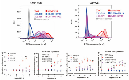 To investigate whether mutation of the conserved NBW3.39E and NBW3.43L alters the functional expression of ORs, we constructed E3.39D and L3.43Y mutants. We selected Olfr1508 (agonist: Cu2+ ion) and Olfr733 (agonist: hexanal), which are highly expressed in the cell membrane without the assistance of RTPs [19,27]. The E3.39D and L3.43Y mutations significantly reduced their cell surface expression and ligand response ability (Figure 5).