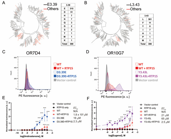 We examined the effects of the 3.39E and 3.43L mutations on human Ors. In human Ors, E(Glutaminc acid) accounted for 81% (315/390) of NBw3.39 and L(Leucine) accounted for 92.5% (361/390) of NBw3.43. (Figure 6A,B). Ors without conserved E3.39 tend to be clustered in a few families, suggesting evolutionary advantages in these families. On the other hand, the Ors whose 3.43 was not L were dispersed throughout the phylogenetic tree, and many of them were pseudogenes. Then, we constructed 3.39E and 3.43L mutants and examined their surface expression and ligand response (Figure 6 and Figure S6). OR7D4 is one of the characteristic Ors in which human perception of androstenone changes dramatically depending on genetic variants [28]. The D3.39E mutation significantly increased the cell surface expression of OR7D4, and the detection limit of androstenone (5α-androst-16-en-3-one) was improved to less than 1 µM (Figure 6C). A significant increase was also observed in OR10G7 Y3.43L, which was expressed without co-expression of RTP1S (Figure 6D). This mutant also detected a significant response against Eugenol even at lower stimulus concentrations than the wild type [29]. Mutations in the NBW3.39 and 3.43 amino acids can be effective ways to improve the functional expression of human ORs. Taken together, the amino acids located at NBW3.39 and 3.43 are involved in regulating the expression of mammalian ORs.