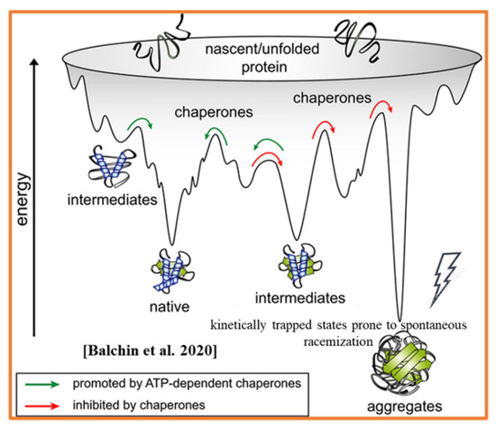 NS of homochiral proteins (trapped in a local energy minimum) is thermodynamically only relatively stable and, therefore, is prone to further spontaneous relaxation to aberrant conformation and aggregative states. Such spontaneous processes can be triggered by amino acid (AAs) racemization [23,24]. Spontaneous racemization is known as one of the unavoidable degrading forces of the functional state of proteins. More (than native) thermodynamically stable states of proteins such as amyloids, fibrils, and aggregates are associated with protein aging translated to the cellular and organism levels. However, even recent advances in the understanding of protein folding and miss-folding ignore the homochirality of the NS and, correspondently, overlook the contribution of spontaneous racemization to protein aging [25] (Figure 1). Furthermore, protein aggregation is known to slow down the rates of structural conversions (leading to kinetic trapping), extend the cellular lifetime of trapped protein, and make them prone to the impact of spontaneous (molecular environment-specific) racemization.