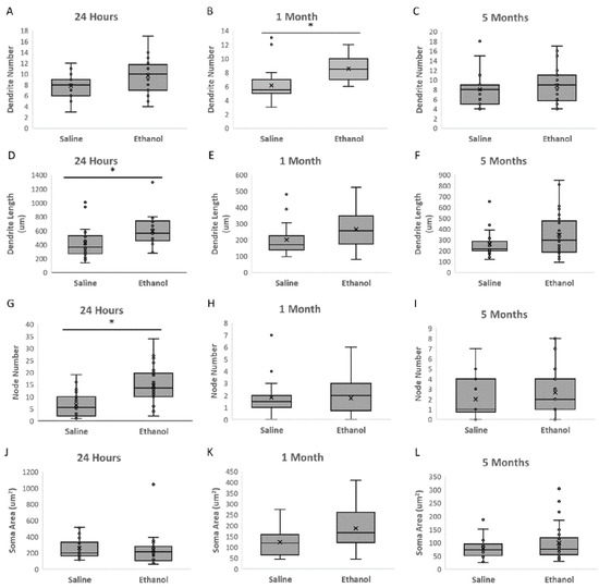 Ethanol treatment during synaptogenesis significantly increases MSN dendritic length and number of nodes after 24 h. (A–C). Dendritic number was significantly greater in ethanol-treated animals 1 month after exposure (B); p = 0.002), and it trended towards significance at 24 h (A); p = 0.065). There was not enough statistical power to conclude that ethanol did not affect dendrite number at 5 months of age (C); Power: 0.717). (D–F). Dendritic length was significantly greater in ethanol-treated animals 24 h after exposure ((D); p = 0.027), there was not enough statistical power to determine the effects at 1 month (E); Power: 0.3805), and there was no significant difference at 5 months of age (F); p = 0.384). (G–I). Dendritic node number was significantly greater in ethanol-treated animals 24 h after exposure (G); p = 0.018), but the number of nodes was not significantly different at 1 month (H); p = 0.868). There was not enough statistical power to conclude there was no significant node difference at 5 months of age (I); Power: 0.6472). (J–L). The small sample and effect size provides insufficient statistical power to determine if there is an effect of ethanol on soma size. For all experiments, between 6 and 8 medium spiny neurons in the caudate-putamen region of the striatum were traced in 3–5 animals at each treatment level (n = 4 saline and n = 4 ethanol at 24 h; n = 3 saline and 3 ethanol at 1 month; n = 3 saline and n = 5 ethanol at 5 months). For all panels, error bars represent SEM values. *: significant at p < 0.05.