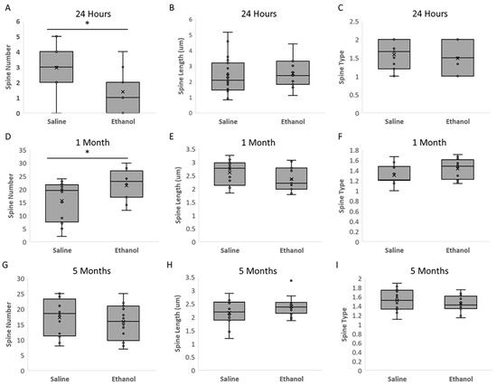 Acute high-dose ethanol administration during synaptogenesis significantly affects dendritic spine number. (A–C). Twenty-four hours post-ethanol administration: (A). number of dendritic spines was significantly decreased in ethanol-treated animals 24 h after exposure (p = 0.002), but there was not sufficient statistical power to determine if there was an effect on spine length (B); Power: 0.744) or spine type (C); power: 0.7003). (D–F). One-month post-ethanol administration: (D). number of dendritic spines was significantly increased in ethanol-treated animals 1 month after exposure (p = 0.030), but there was no significant effect of treatment on spine length (E); p = 0.944). There was not sufficient statistical power to determine if there was an effect on spine type (F); Power: 0.4577). (G–I). Five months post-ethanol administration: No significant differences were detected between ethanol and saline groups 5 months after treatment for spine number (G), spine length (H), or spine type (I), but there was insufficient statistical power to determine the impact of ethanol treatment (power: 0.4496, 0.4577, and 0.5183, respectively). For spine analysis, 3–5 animals were used in each treatment group (n = 5 saline and 4 ethanol at 24 h; n = 3 saline and n = 3 ethanol at 1 month; n = 3 saline and n = 4 ethanol at 5 months). *: significant at p < 0.05.