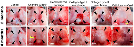Macroscopic images of the knee joint with an osteochondral defect. The observation time is 2 months (a–f) and 4 months (g–l). The black arrows indicate the boundaries of the defect, the yellow arrows indicate the places of ulceration in the area of surgical intervention.