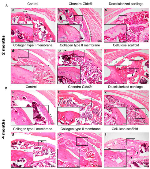 Histological preparations of the rat knee joint, H&E staining. The observation time is 2 months (A) and 4 months (B). a—control (no scaffold), b—Chondro-guide, c—decellularized cartilage, d—membrane made of collagen type I, e—membrane made of collagen type II, f—cellulose. The black arrows indicate the boundaries of the defect, the black arrowheads in (Af,Bf) indicate the part of the non-resorbed implant migrated into the secondary ossification center. Magnification of the image—×25, magnification of the enlarged area—×100.