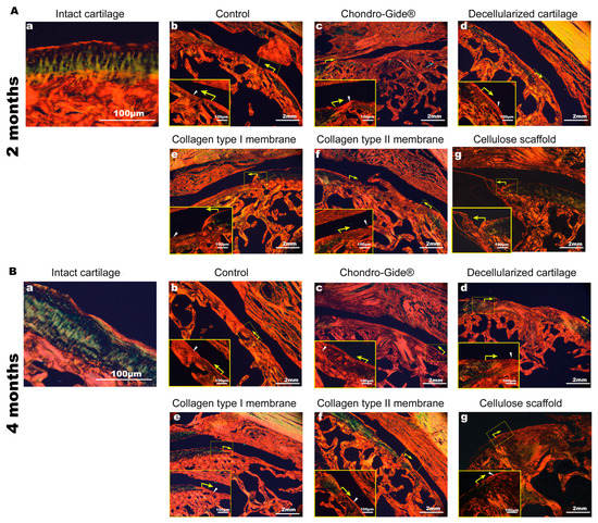 Organization of collagen fibers in the area of the transition of cartilage to the damage zone. Picrosirius red staining. The observation time is 2 months (A) and 4 months (B). Small labels a–g correspond to the text above the corresponding pictures. The yellow arrows indicate the border of the transition of the intact zone to the area of surgical intervention. The white arrowheads indicate the location of the collagen fibers in the defect area. Magnification of the image—×25, magnification of the enlarged area—×100.