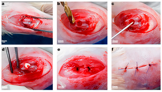 Stages of the operation for the formation of an osteochondral defect. (a) Arthrotomy; (b) creation of a full-thickness defect of articular cartilage in the interstitial fossa; (c) perforation of the subchondral layer (spongy substance); (d) implantation of the scaffold in the defect; (e,f) suturing of the operating wound.