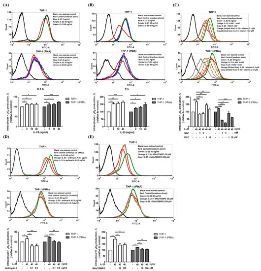 IL-25 is defined as an upstream epithelial cytokine driving the production of potent Th2 cytokines, such as IL-5 and IL-13, which have been proven to be involved in severe, difficult-to-treat eosinophilic asthma. Therefore, we first examined the effect of another Th2-like cytokine, IL-25, on ROS production in THP-1 cells and THP-1 derived macrophages. IL-25 (2–40 ng/mL) induced ROS production in THP-1 cells and THP-1 derived macrophages at the 0.5 h (Figure 1A) and 2 h (Figure 1B) time points. We selected 2 h as a detection time point to investigate the antioxidative effect on IL-25-induced ROS production. The IL-25-induced ROS production in THP-1 cells and THP-1 derived macrophages were significantly inhibited by NAC, vitamin C (Figure 1C). Moreover, we further used mitochondrial complex III inhibitor antimycin A and mitochondrial-targeting antioxidant MitoTEMPO to examine the mitochondria-specific antioxidative effect. The IL-25-induced ROS production in THP-1 cells and THP-1 derived macrophages were also significantly suppressed by antimycin A (Figure 1D) and MitoTEMPO (Figure 1E).
