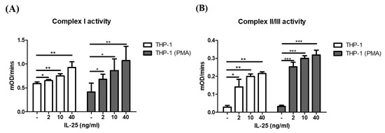 IL-25 could induce ROS production in THP-1 cells and THP-1 derived macrophages, and mitochondria are the major source of ROS production. Therefore, we further measured the mitochondrial complex activity of THP-1 cells and THP-1 derived macrophages after IL-25 stimulation. As shown in Figure 2A, the activity of mitochondrial complex I in THP-1 cells and THP-1 derived macrophages was significantly increased by IL-25 stimulation in a dose-dependent manner. In addition, we also observed that IL-25-induced mitochondrial complex II/III activity of THP-1 cells and THP-1 derived macrophages was significantly increased (Figure 2B).