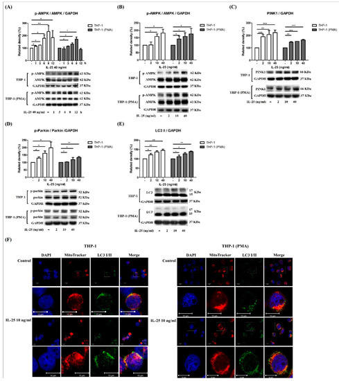 IL-25-induced AMPK activation and mitophagy-related proteins expression in THP-1 cells and THP-1 derived macrophages. (A) The time course of p-AMPK expression was determined at 1, 3, 6, 8, and 12 h with IL-25 (40 ng/mL) or medium alone treatment in THP-1 cells (white bar) and THP-1 derived macrophages (gray bar). Data present the means ± SD of 3 independent experiments. The expression of p-AMPK (B), PINK1 (C), p-parkin (D), and LC3 (E) by medium alone or IL-25 (2, 10, and 40 ng/mL) treatment in THP-1 cells (white bar) and THP-1 derived macrophages (gray bar) at 8 h time point were determined by western blot. * p < 0.05, ** p < 0.01, and *** p < 0.001; n = 3, means ± SD. The confocal data show the nuclear (DAPI), mitochondria (MitoTracker), and LC3 I/II fluorescence images by medium alone or IL-25 (10 ng/mL) treatment (F). Scale bars = 10 μm in pictures.