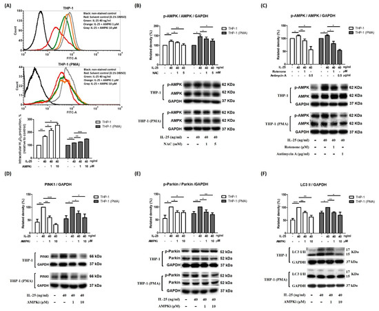 IL-25-induced mitophagy-related proteins expression via ROS-AMPK pathway in THP-1 cells and THP-1 derived macrophages. (A) representative histograms of cell counts (counts) vs. DCF fluorescence (FITC-A) (above), and the mean fluorescence intensity (MFI) of DCF expressed as a percentage relative to control cells (below). (A) After pretreatment with solvent control (0.1% DMSO) or AMPKi (1 and 10 µM) for 0.5 h, the IL-25-induced ROS production in THP-1 cells (white bar) and THP-1 derived macrophages (gray bar) were measured. n = 3, means ± SD. (B) After medium alone or NAC (1 and 5 mM) pretreatment for 0.5 h followed by IL-25 treatment for 8 h, IL-25-induced p-AMPK expression in THP-1 cells (white bar) and THP-1 derived macrophages (gray bar) were determined. n = 4, means ± SD. (C) After pretreatment with solvent control (0.1% DMSO), rotenone (1 μM) or antimycin A (0.5 μg/mL) for 0.5 h followed by IL-25 treatment for 8 h, IL-25-induced p-AMPK expression in THP-1 cells (white bar) and THP-1 derived macrophages (gray bar) were deter-mined. n = 3, means ± SD. After pretreatment with solvent control (0.1% DMSO) or AMPKi (1 and 10 µM) for 0.5 h followed by IL-25 treatment for 8 h, the PINK1 (D), p-Parkin (E), and LC3 I/II (F) protein levels were determined by western blot. n = 3, means ± SD. * p < 0.05, ** p < 0.01, and *** p < 0.001.