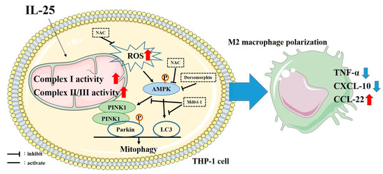 Schematic of the proposed intracellular mechanisms underlying IL-25-induced M2 macrophage polarization. IL-25 increased ROS production and mitochondrial complex I and complex II/III activity. Subsequently, activation of mitophagy, and then shifted M1/M2 chemokine expression via the AMPK signaling pathway in human monocyte cell line.