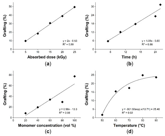 Graft by varying temperature and monomer concentration completed the grafting study. Regarding the effect of monomer concentration, it had a maximum grafting of 77.5% with a linear tendency (Figure 1c), but at the lower monomer concentrations (20%), the graft was adequate to incorporate a superficial modification. Finally, the results indicated that the minimum activation temperature for this system is about 50 °C, which is congruent with the temperature to activate peroxides. The grafting degree increased progressively up to 80 °C, but at 90 °C the graft slightly decreased, indicating that when the reaction took place at 90 °C, the homopolymerization was benefited, so the graft was affected (Figure 1d). Therefore, the results suggest a possible control on the grafting rate either by reaction time or reaction temperature, offering a reasonable percentage of functionalization using a low absorbed dose of 5 kGy and low monomer concentration, thus, ensuring lower damage in the properties of the matrix.