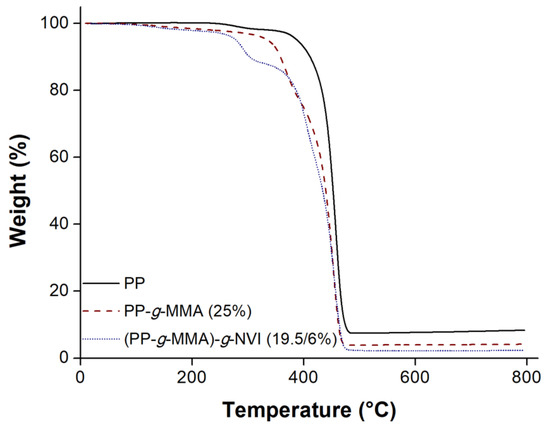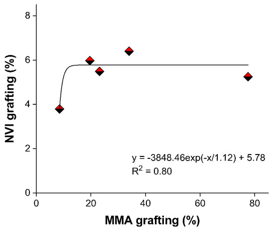 The grafting of NVI was carried out on PP-g-MMA with different grafting degrees from 8.5 to 77.5%. The NVI grafting degree was lower compared to the results obtained in the MMA grafting, which indicates a lower monomer reactivity. Since the MMA grafting degree of PP-g-MMA was higher, the grafting yield of NVI did not increase proportionally, obtaining yields ranging from 4 to 6.5%. Hence, it is understood that a slight modification with MMA is enough to promote the graft of NVI in a second step (Figure 2). In the following lines, the notation (PP-g-MMA)-g-NVI (x/y%) represents the binary grafted weight percent of “x” PMMA and “y” PNVI, respectively.