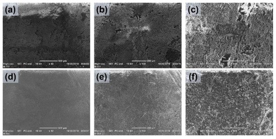 SEM images of (a–c) PP-g-MMA (17%) and (d–f) (PP-g-MMA)-g-NVI (19.5/6%), augmented from left to right ×50, ×100, and ×500.