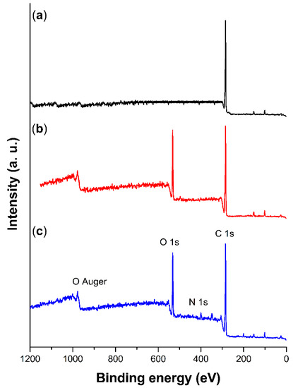 XPS scan of: (a) non-irradiated PP, (b) PP-g-MMA (17%), and (c) (PP-g-MMA)-g-NVI (77.5/5%).