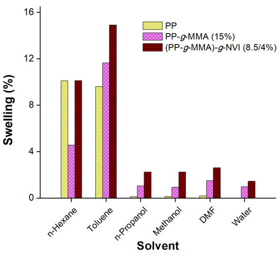 PP-g-MMA films with different MMA grafting degree (Table 4) were weighed and placed into glass ampoules containing 6 mL of NVI in toluene (50 vol%). Then, oxygen was removed from the ampoules with freezing and thawing cycles (see Section 4.2.1), then the ampoules were sealed with a blowtorch and irradiated with an absorbed dose of 15 kGy at room temperature. Finally, the ampoules were open, and the grafted films were rinsed with methanol and dried into a vacuum oven at 60 °C for 24 h. The weight of films was recorded to calculate the grafting degree according to Equation (1).