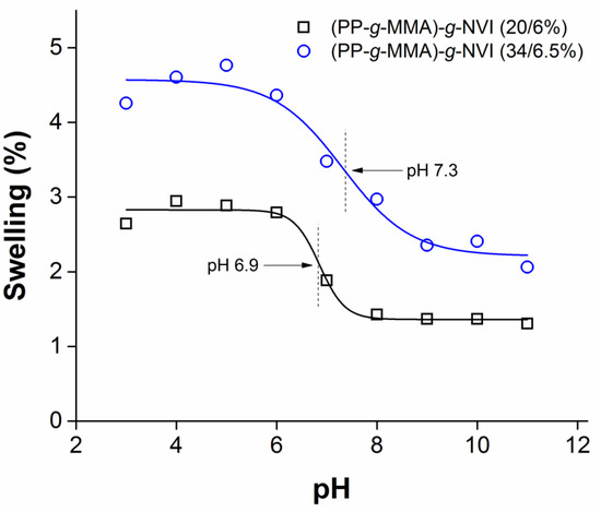 One of the characteristics of NVI-containing polymers is their pH response. This property is conferred by grafted PNVI, an electron donor polyelectrolyte (i.e., a Lewis base) that shrinks or expands by varying pH, as was verified with the study of swelling in a pH range of 3 to 11. In this case, two films of (PP-g-MMA)-g-NVI with different compositions were analyzed, as shown in Figure 8. The behavior was similar in both films since they were hydrophilic at acid pH and hydrophobic at alkaline pH, with inflection points at pH 6.9 for (PP-g-MMA)-g-NVI (20/6%) and pH 7.3 for (PP-g-MMA)-g-NVI (34/6.5%), respectively. The most significant difference was the higher swelling in the film with more PMMA grafted, so it is inferred that this polyacrylate conferred a more hydrophilic behavior to the film. Although swelling between 1 and 4% would seem low, the thickness of the films was 18 mm, and samples were above 250 mg, so even small weight changes, such as 0.1 mg, were detected. Furthermore, the swelling percentage was enough to load and release the vancomycin quantitatively (see Section 2.7), because in this case, the swelling occurred exclusively on the surface. Thus, it is concluded that the surface of the grafted films is moderately hydrophilic and pH-responsive can uptake water and molecules between their chains.