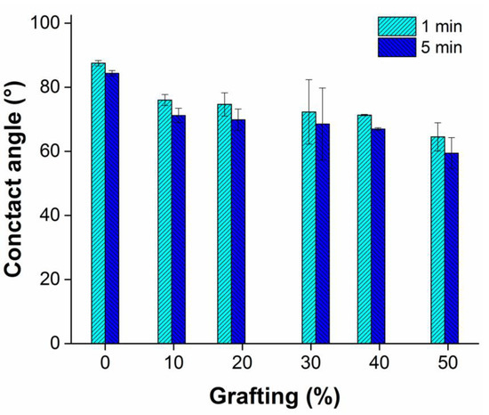Once MMA is grafted onto the surface, the wettability was an important parameter because the acrylic chains are moderately hydrophilic, as swelling experiments showed (see Section 2.5). Thereby, the contact angle before and after graft can be interpreted in terms of surface energy, increasing in this case, which means that grafted films were more hydrophilic than the pristine PP films, even when the grafted chains had a hydrophobic moiety, the amorphous acrylic chains increased the wettability (Figure 9). The contact angles determined by the drop of water on the pristine PP film were 87.5 ± 0.9° at 1 min and 84.4 ± 0.9° at 5 min, and the highest compared with the grafted films, in which case the contact angle decreased as the MMA graft percentage increased. The change from hydrophobic to hydrophilic occurred since the first sample with the lowest graft that was PP-g-MMA (10%), with angles of 76 ± 1.7° at 1 min and 71.2 ± 2.3° at 5 min and decreased consecutively up to the last sample, PP-g-MMA (50%), exhibiting a contact angle of 64.5 ± 4.4° at 1 min and 59.4 ± 4.8° at 5 min, being the lowest angle and therefore the most hydrophilic.