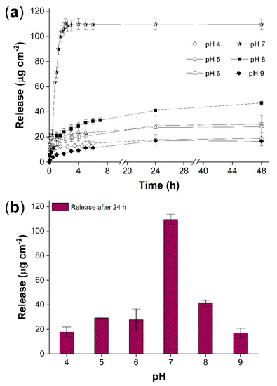 At neutral pH, the release rate was the highest, and the maximum reached within the first 2 h, which was 109.5 ± 4.3 μg cm−2 (Figure 10a), which was around 83% of the total loaded vancomycin. While in alkaline and acid pH, the release rate and the amount of vancomycin released decreased considerably (Figure 10b). It was found that even after 48 h, the release value at pH 8 was only 47.1 ± 2.5 μg cm−2. In all buffers, unlike neutral pH, release rates were slower, and the maximum concentration was not reached at 48 h. When the kinetics were checked, it was found that they followed a different path than at neutral pH, given that under neutral conditions the release rate was around three times and in a fraction of the time (2 h). Therefore, there is an expedited diffusion at pH 7 and a prolonged release at pH 4, 5, 8, and 9.