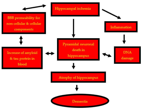Development of pyramidal neuron death, atrophy of hippocampus and finally dementia. BBB—blood–brain barrier.