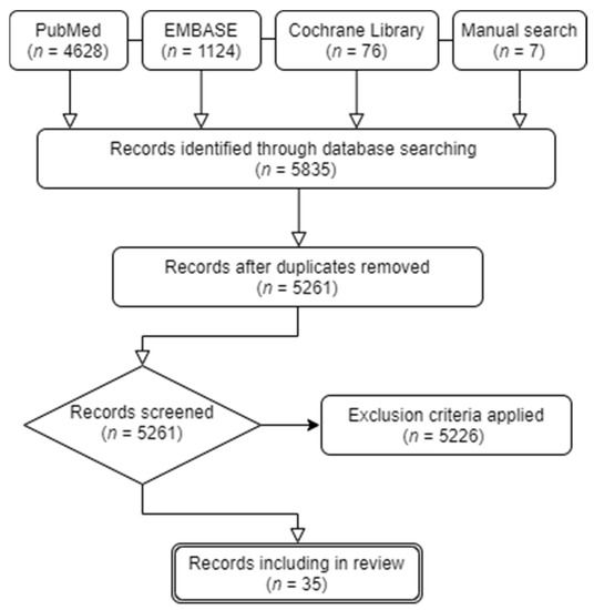 Potentially eligible studies were identified in a search of the US National Library of Medicine electronic database (PubMed), EMBASE, and Cochrane Library, using a combination of the following terms: “Facial palsy”, “Bell’s palsy”, “Ramsay-hunt syndrome”, “biomarker”, “prognosis”, and “factor.” Additionally, studies were included in the studies using a manual search method. Only studies published after 2000 were included in the analysis. The initial search was performed in April 2021 and updated in October 2021. Studies were selected for review based on the following criteria: (1) studies investigating the association between APFP and biomarkers; (2) in English; and (3) studies reporting outcomes based on prognostic and/or predictive biomarkers. Studies were excluded if they met the following criteria: (1) not in English; (2) duplicate publications; (3) meta-analyses and systemic reviews; (4) no human study population; (5) unclear clinical implications; and (6) not related to the review topic. Finally, we included possibly relevant studies that were screened to confirm their eligibility. A literature search identified 5835 studies. After initial title screening and manual reduplication, 574 studies were excluded (not relevant to the topic), and 5261 records remained for abstract review. We performed a full abstract review evaluation of the remaining studies by applying exclusion criteria. Thirty-five studies that investigated prognostic and predictive biomarkers for APFP were finally included in this study (Figure 1). In all studies, the potential of blood biomarkers for APFP was evaluated. Since biomarkers were evaluated using various techniques and there is no standard categorization for AFPF biomarkers, prognostic biomarkers were subdivided as follows: (1) inflammatory, (2) metabolic, (3) hemostatic, (4) immunological, and (5) oxidative (Figure 2). Information regarding the studied biomarkers, including study design, sample size, age, and results/conclusions, are listed in table format (Table 1, Table 2, Table 3, Table 4 and Table 5).