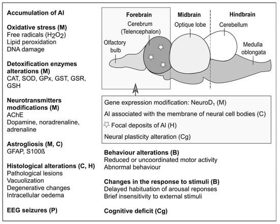 The neurotoxic action of Al impacts motor and cognitive capabilities. At the cellular level, several important mechanisms are affected: axonal transport, neurotransmitter synthesis, synaptic transmission, calcium homeostasis, energy metabolism, inflammatory responses, cell death, and glial cell activation [27]. At the molecular level, serious modifications occur in protein phosphorylation/dephosphorylation and degradation, gene expression, DNA repair, formation of reactive oxygen species, antioxidant enzyme activity, NF-kB and JNK pathways, and DNA binding [27]. However, these changes are essentially observed in mammals, and only a few studies have addressed the effects produced on the nervous system of aquatic vertebrates. Table 1 and Figure 1 report the effects of Al on the nervous system of several aquatic vertebrates.