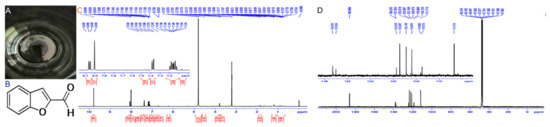 Compound 2: yellowish-white powder (methanol), molecular formula was C9H6O2, and molecular weight was 146.14. 1H NMR (500 MHz, MeOD) δ7.66 (d, J = 16.2 Hz, 3 H), 6.12 (d, J = 16.1 Hz, 3 H), 5.82 (s, 3 H), 5.66 (s, 3 H), 5.41–5.30 (m, 2 H), 4.83 (s, 94 H), 3.84 (dd, J = 17.2, 9.3 Hz, 2 H), 3.52 (d, J = 26.9 Hz, 4 H), 3.52–3.37 (m, 1 H), 3.21 (dt, J = 3.3, 1.6 Hz, 21 H), 2.62 (t, J = 6.4 Hz, 18 H), 2.51–1.89 (m, 90 H), 1.82 (dd, J = 13.3, 4.7 Hz, 11 H), 1.62 (d, J = 13.3 Hz, 2 H), 1.57–1.34 (m, 50 H), 1.34–1.05 (m, 76 H), 1.07 (d, J = 17.8 Hz, 1 H), 1.11–0.99 (m, 5 H), 0.95 (d, J = 17.9 Hz, 19 H), 0.81 (t, J = 7.0 Hz, 8 H), 0.00 (s, 1 H); 13C NMR (126 MHz, MeOD) δ48.45–47.67 (m), 47.60 (s), 47.42 (s), 47.25 (s), 47.08 (s). The above data were consistent with the literature [22]. Therefore, the compound was identified as benzo[b]furan-2-carboxaldehyde (BFC) (Figure 3).