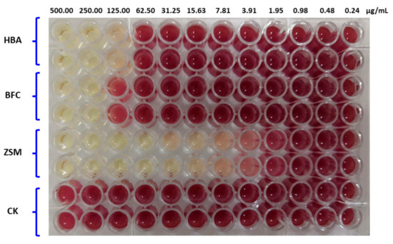 From Table 1, it can be seen that HBA had inhibitory effects on A. avenae subsp. citrulli, and the zone of inhibition was 2.29 cm, which was comparable to the positive control and the difference was not significant (p > 0.05). BFC did not have any bacteriostatic effects on A. avenae subsp. citrulli, and the zone of inhibition was lower than the positive control (Table 1). Two-fold dilution in a 96-well plate was used for MIC measurement of HBA. The results indicated that the MIC of HBA towards A. avenae subsp. citrulli was 125 μg/mL, thus showing potent bacteriostatic activity with potential for further research and development (Figure 4).