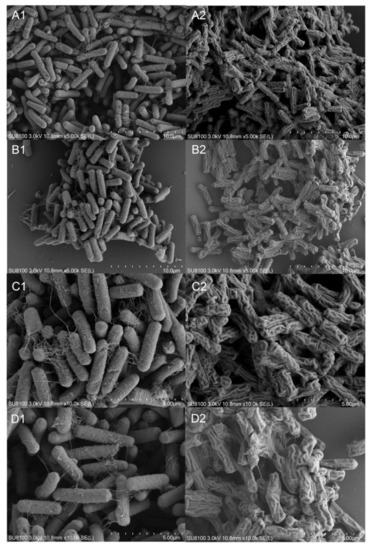 Under 5000× magnification, the untreated bacteria appeared rod-shaped, filled, and rounded, with clear edges, neatly stacked and arranged, and consistent in size, and ruptures and distortion were absent (Figure 5A1,B1). The HBA-treated bacteria were shriveled, wrinkled, distorted, and deformed, and the bacterial surface was uneven and even ruptured (Figure 5A2,B2). Under 10,000× magnification, the untreated bacteria had clear edges and smooth surfaces, protrusions and depressions were absent, and many filaments were present (Figure 5C1,D1). The HBA-treated bacteria had a coarse and uneven surface and inconsistent depth, and some bacteria were ruptured or disintegrated (Figure 5C2,D2). This demonstrated that HBA could cause bacterial deformation.