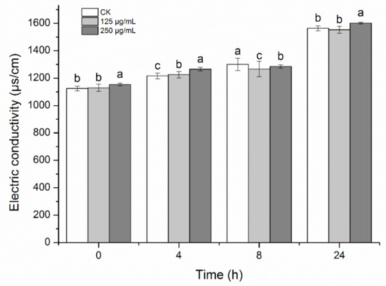 Based on the experimental method of Wei [51], the density of the A. avenae subsp. citrulli suspension in the logarithmic growth phase was adjusted to OD600 = 0.5, and HBA was added to a final concentration of 125 and 250 μg/mL. Ultrapure water was used as a control. After treatment for 0, 4, 8, and 24 h, 5 mL of culture medium was collected and centrifuged at 6000 r for 10 min. The supernatant was diluted 20-fold with ultrapure water, and a conductivity meter was used to measure conductivity. Every treatment was performed in triplicate.