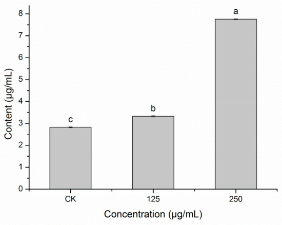 Pyruvate is an important intermediate in the tricarboxylic acid cycle and its level can effectively reflect changes in in vivo metabolic pathways. HBA significantly affected the normal metabolism of pyruvate in bacteria. The pyruvate level in the bacteria was significantly higher after HBA treatment compared with the control, and this difference was significant (p < 0.05). The higher the HBA concentration, the greater the pyruvate level in the bacteria (Figure 10). This shows that HBA affects the tricarboxylic acid cycle in bacteria and accelerates pyruvate metabolism.