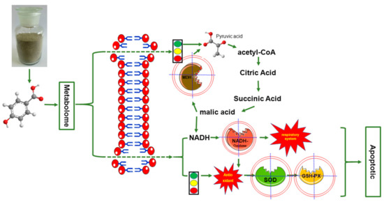 In short, the molecular mechanism of HBA inhibiting A. avenae subsp. citrulli may be as follows: HBA damaged the permeability and integrity of cell membrane, entered the cytoplasm to affect the TCA cycle, destroyed MDH activity, blocked the dehydrogenation of related enzymes, reduced the number of NADH, reduced the activity of NADH oxidase due to the lack of substrate, and abnormal electron transfer in the respiratory chain, which further reduced the activities of SOD and GSH-PX in the antioxidant system, and led to cell apoptosis (Figure 12).