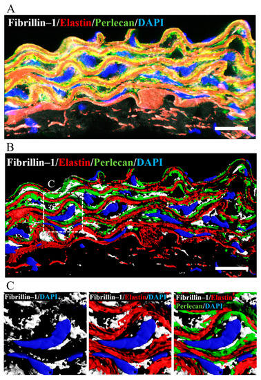 Perlecan had previously been shown to colocalize with elastin and fibrillin-1 in the connective and vascular tissues such as ligaments, paraspinal blood vessels, and synovial blood vessels [15,41,42]. To confirm the colocalization of perlecan, elastin, and fibrillin-1 in aortic tissue, we performed immunostaining using anti-perlecan, -elastin, and -fibrillin-1 antibodies. Our analysis revealed the colocalization of perlecan with elastin and fibrillin 1 (Figure 7A). A 3D surface reconstruction of confocal images. performed with IMARIS software, revealed that perlecan localized along the elastic lamina (Figure 7B). Perlecan immunostaining was observed at the intersection of elastin and fibrillin-1 (Figure 7C). The result suggested that perlecan, which is a binding module of many extracellular matrix components, aids in the integration of elastic fibers.