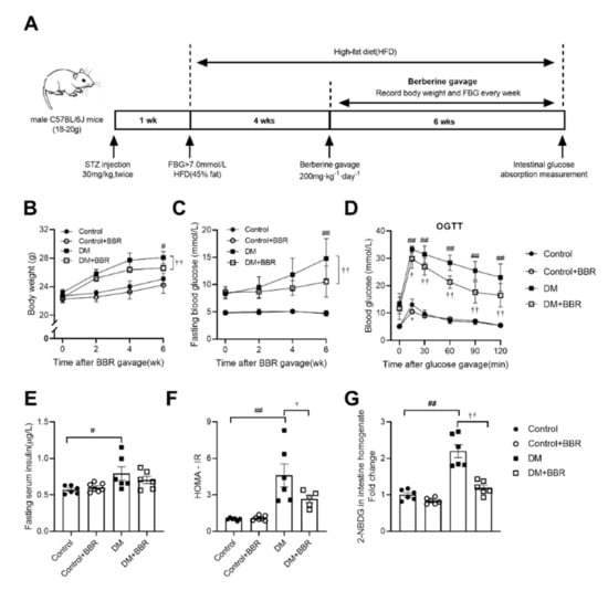 Berberine treatment (200 mg·kg−1·day−1, BW) for 6 weeks decreased body weight and fasting blood glucose and improved glucose tolerance and systemic insulin sensitivity and intestinal glucose absorption in diabetic mice. (A) Schematic representation of experimental protocol. (B,C) Body weight and fasting blood glucose changes in control, control + BBR, DM, and DM + BBR groups. (D) Berberine treatment for 6 weeks improved glucose tolerance in diabetic mice. (E,F) Berberine treatment for 6 weeks improved systemic insulin sensitivity in diabetic mice. (G) Berberine treatment for 6 weeks decreased intestinal 2-NBDG absorption in diabetic mice. Data are expressed as mean ± SEM (n = 6). Control, control mice; Control + BBR, control mice treated with berberine (200 mg·kg−1·day−1 gavage), DM, diabetic mice; DM + BBR, diabetic mice treated with berberine (200 mg·kg−1·day−1 gavage). Control vs. Control + BBR; Control vs. DM, # p < 0.05, ## p < 0.01; DM vs. DM + BBR, † p < 0.05, †† p < 0.01.