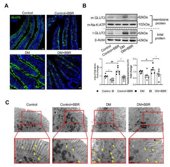 Berberine treatment decreased GLUT2 localization in BBM of intestinal epithelial cells in diabetic mice. (A) GLUT2 (green fluorescence) in BBM was decreased after berberine treatment (200 mg·kg−1·day−1, BW) for 6 weeks, bar = 20 μm, blue fluorescence (DAPI) represented for cell nucleus. (B) Berberine treatment (200 mg·kg−1·day−1, BW) for 6 weeks decreased intestinal GLUT2 expression and GLUT2 membrane localization. (C) Electron micrographs showed that GLUT2 positive gold particles on microvillus and the BBM were decreased in berberine treated diabetic mice (DM + BBR) (200 mg·kg−1·day−1, BW for 6 weeks), bar = 0.5 μm. Data are expressed as mean ± SEM (n = 6). m-Na-K-ATP was used as internal reference of the membrane. Control vs. Control + BBR, * p < 0.05; Control vs. DM, # p < 0.05, ## p < 0.01; DM vs. DM + BBR, † p < 0.05.
