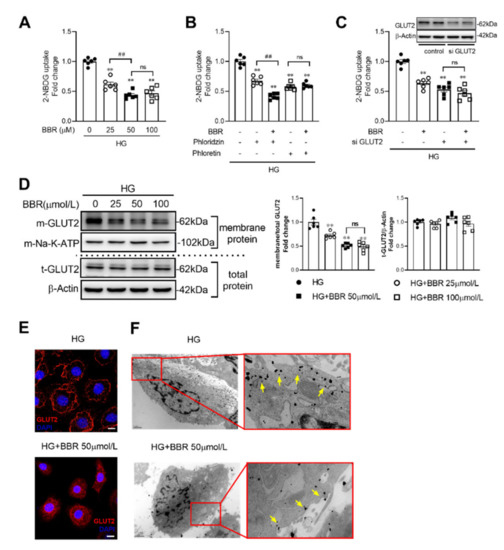 Berberine decreased glucose absorption in a dose-dependent manner through inhibiting GLUT2 translocation in IEC-6 cells. (A) Berberine decreased 2-NBDG uptake in a dose-dependent manner in IEC-6 cells. (B,C) phloretin, a GLUT2 inhibitor, rather than phloridzin, a SGLT1 inhibitor, blocked berberine’s effects on 2-NBDG uptake in IEC-6 cells. (D) siRNA for GLUT2 blocked berberine’s effects on cellular 2-NBDG uptake in IEC-6 cells. (E) GLUT2 (red fluorescence) in BBM was decreased berberine treated (50 μM) for 2 h, bar = 20 μm, blue fluorescence (DAPI) represented for cell nucleus. (F) Electron micrographs showed that GLUT2 positive gold particles at membrane were decreased in IEC-6 cells after berberine treatment (50 μM) for 2 h, bar = 1 μm under low power lens; bar = 400 nm under high power lens. HG, high concentration of glucose (50 mM); phloretin (0.5 mM), GLUT2 inhibitor; phloridzin (0.5 mM), SGLT1 inhibitor; si GLUT2, siRNA for GLUT2; Data are expressed as mean ± SEM (n = 6). m-Na-K-ATP was used as internal reference of the membrane. ** p < 0.01, vs. control; ## p < 0.01; ns, no significance.